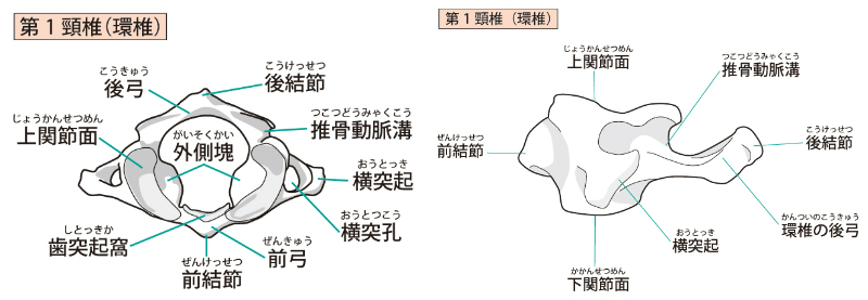 背骨は、それぞれ異なる形・大きさをしており、特に首の1番2番の構造は特殊になっております。
