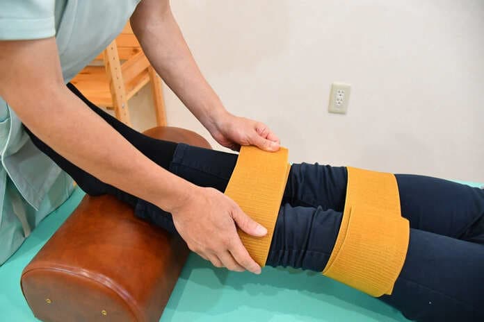 ベットの上に寝て頂き、膝の周囲を触り痛みがないか確認します。