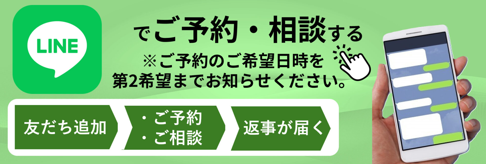 ※LINE画面左下にある”トークアイコン”をタップすると、文章入力画面が表示されますので、ご希望日時を第2希望までお知らせください。(30分単位)
