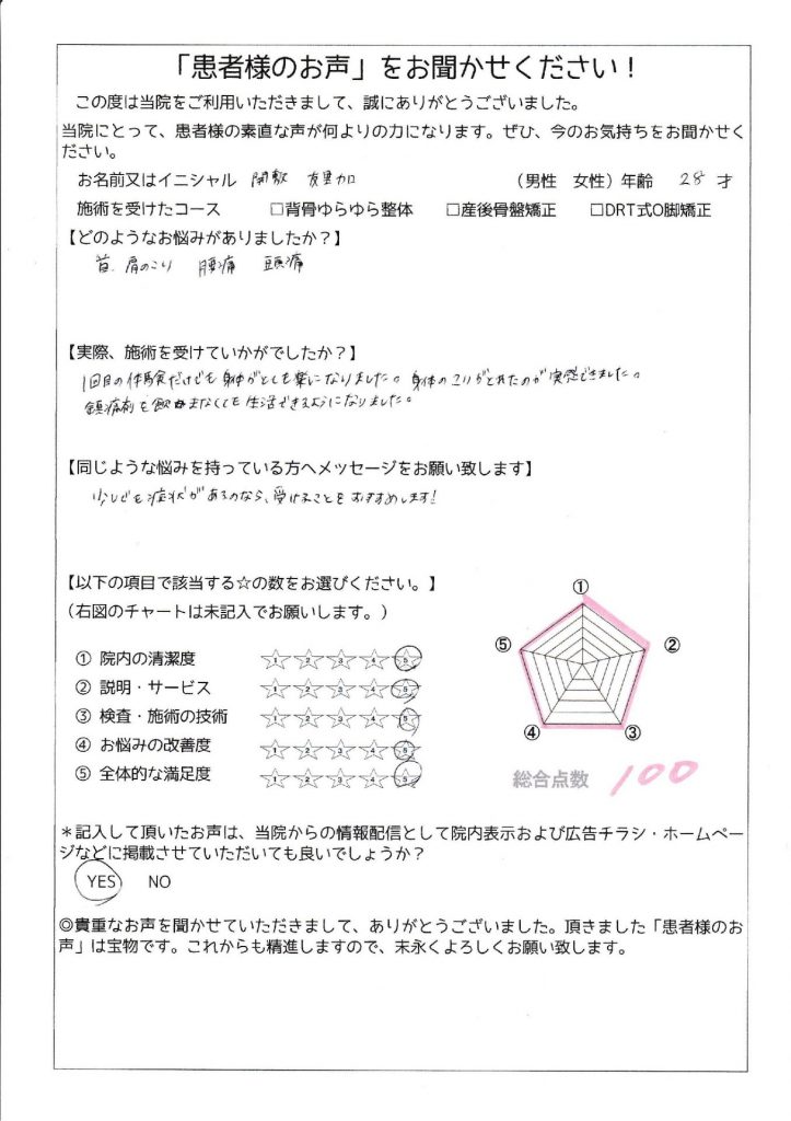 数年前より、肩、首、肩甲骨が凝り固まってしまい、右の肩が上下に動かず、首を動かしたり、肘が何かに触れただけでも時々すごい激痛があり、日常生活を過ごすにも大変影響を受けていました。また、産後から腰痛もあり体中が不調で常に鎮痛剤を飲んでいる状態でした。