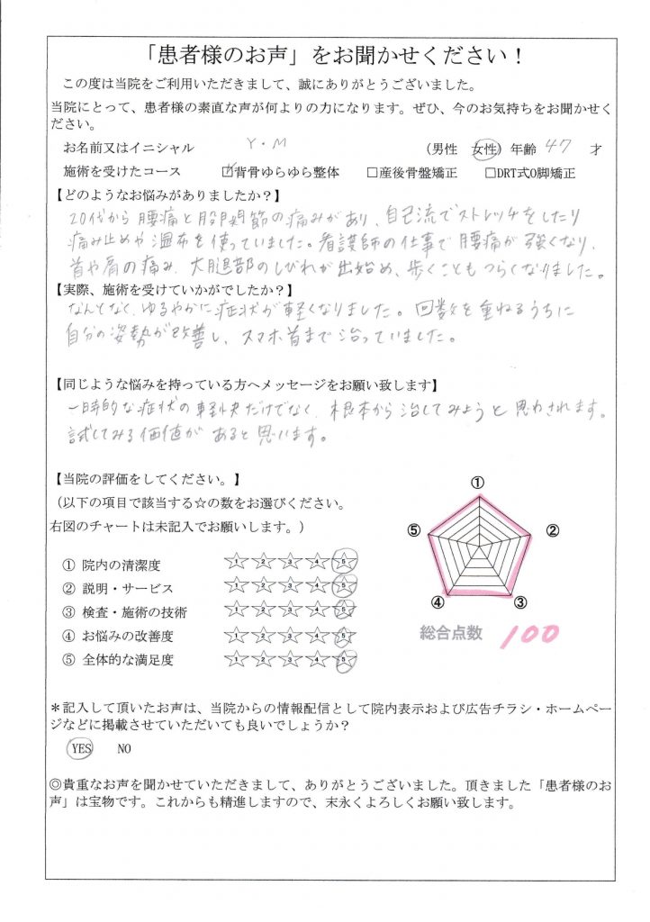 最初は、背中をゆらして、良くなるのか?と思っていましたが、回数を重ねる毎に良くなっていき、1ヶ月で13回受け、ズキズキする痛みもかなり良くなりました。起き上がりや中腰時の痛みも楽になりました。