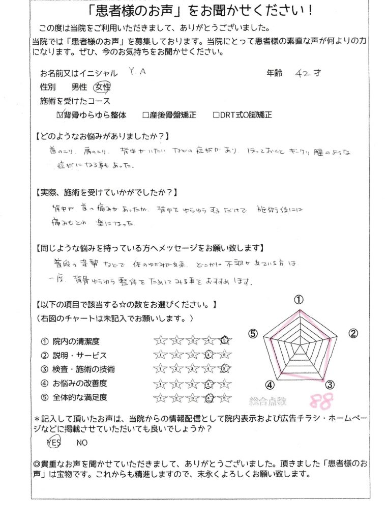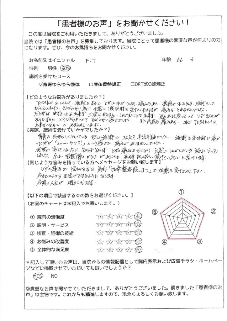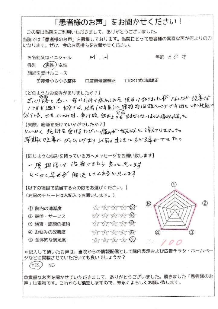 合計5回の施術を受け、最初の3回目までは「治るのだろうか・・」と不安でしたが、その後5回目でほぼ痛みは少なくなりました。(と申しましても10年来の腰痛はやや残っている状況です)