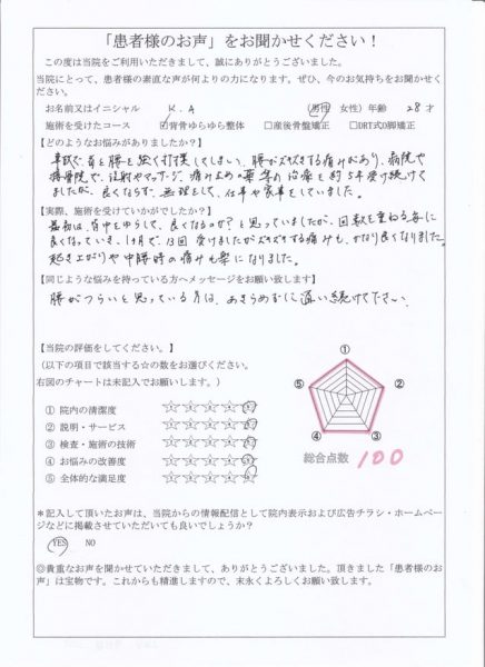 最初は、背中をゆらして、良くなるのか?と思っていましたが、回数を重ねる毎に良くなっていき、1ヶ月で13回受け、ズキズキする痛みもかなり良くなりました。起き上がりや中腰時の痛みも楽になりました。