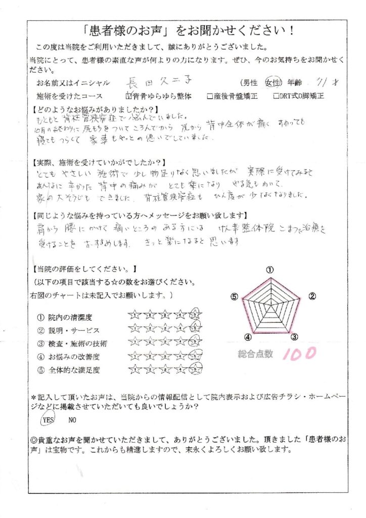 とてもやさしい施術で、少し物足りないなく思いましたが、実際に受けてみるとあんなに辛かった背中の痛みがとても楽になり、やる気もわいて、家の大掃除も出来ました。脊柱管狭窄症も頻度が少なくなりました。